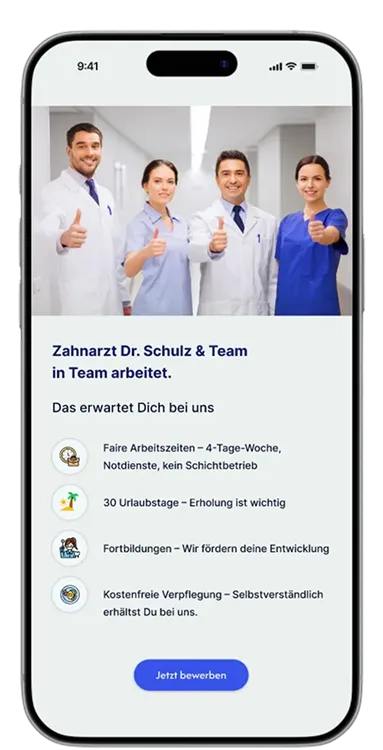Wenn sich potenzielle Mitarbeiter:innen über Ihre Praxis informieren, darf eine Karriere-Seite nicht fehlen – mit allen Details zur Stelle und den Vorzügen als Arbeitgeber.