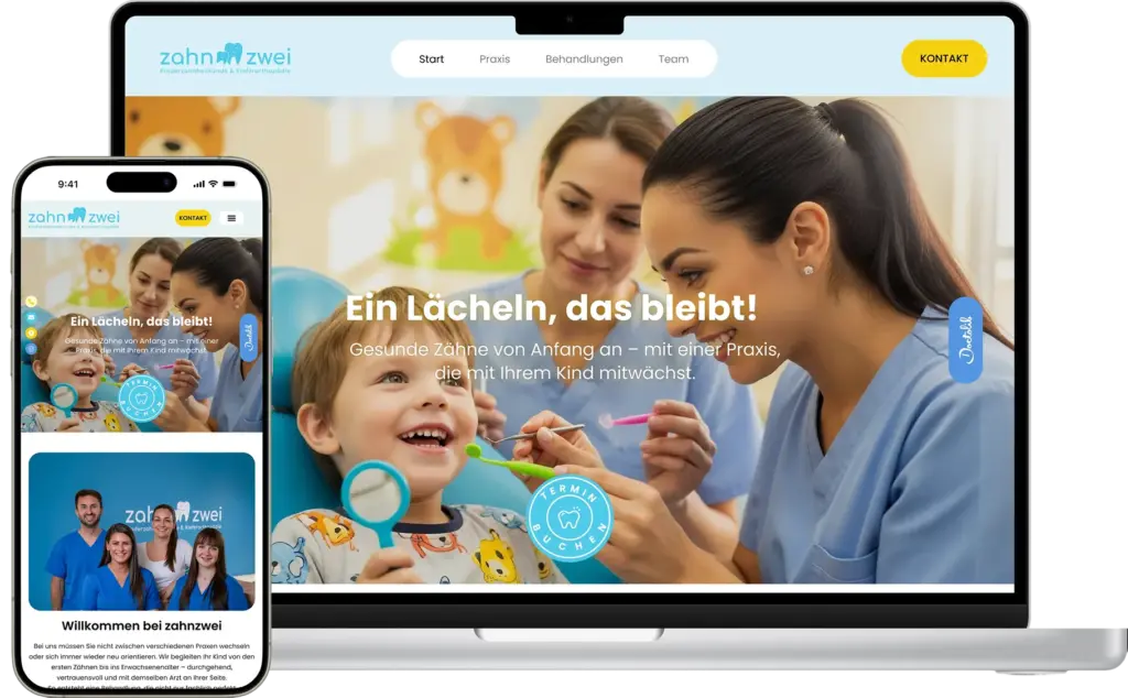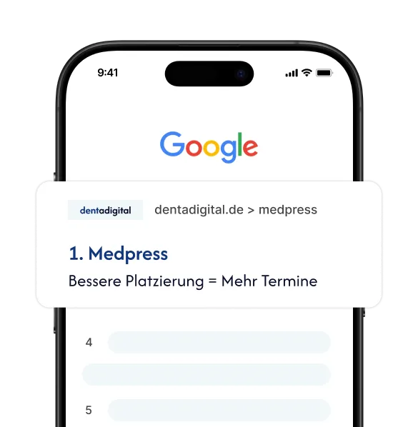 Wir sorgen dafür, dass Ihre Praxis angezeigt wird, wenn Patienten in ihrer Region nach einem Zahnarzt suchen — auf Google und darüber hinaus. Ihre Website enthält die richtigen Inhalte und technischen Einstellungen, damit Menschen Sie finden, Ihnen vertrauen und einen Termin buchen können.